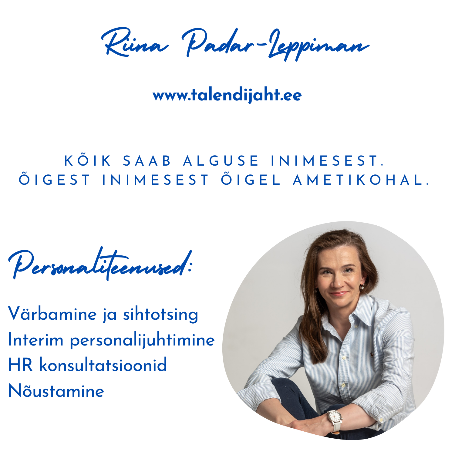 Minu missioon on pakkuda professionaalseid vajaduspõhiseid lahendusi. Põhitegevusalaks on värbamine ja sihtotsing, HR-konsultatsioonid, juhtimisalane nõustamine, organisatsiooni- ja inimeste arendamine, karjäärinõustamine ning outplacement’i tugi.